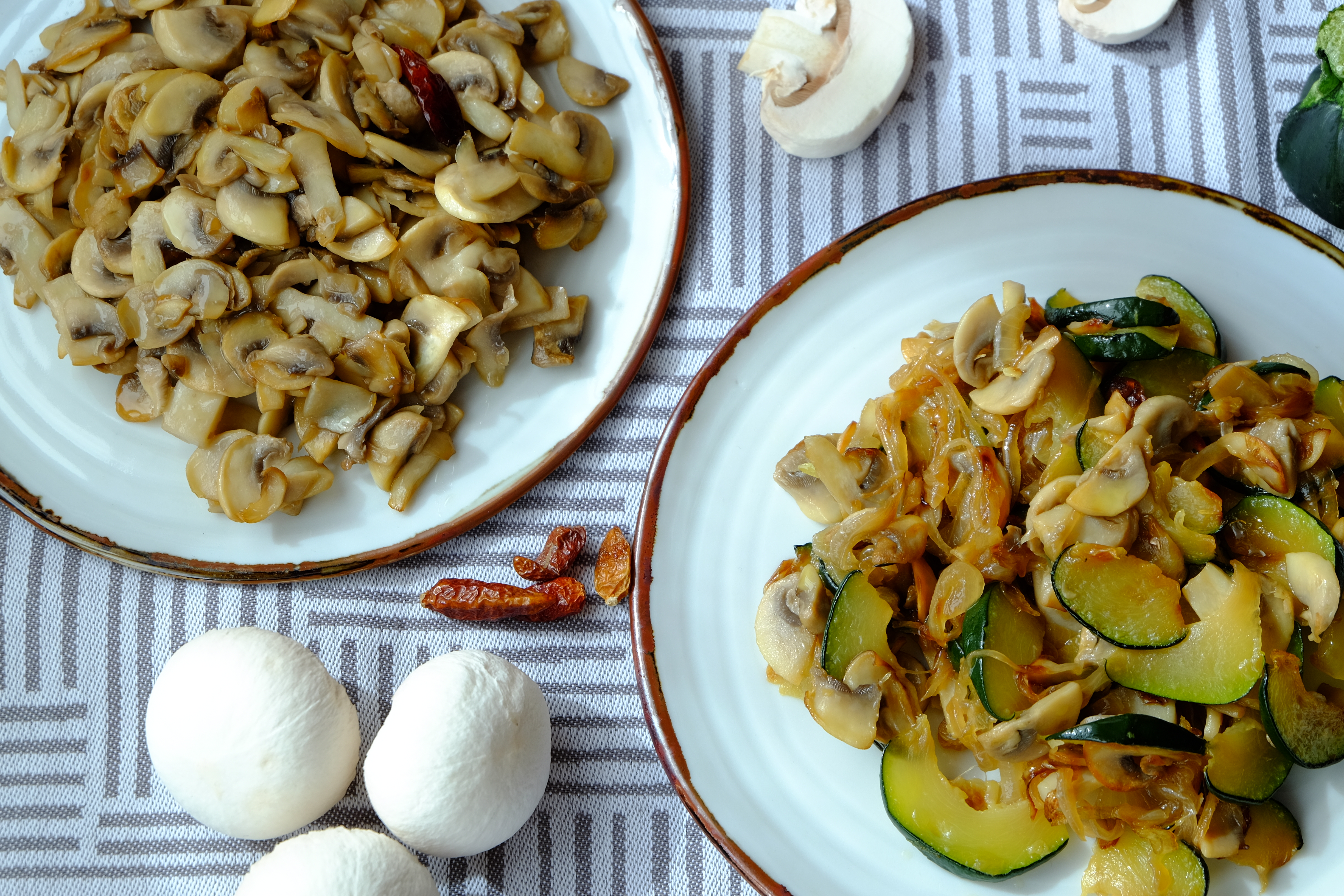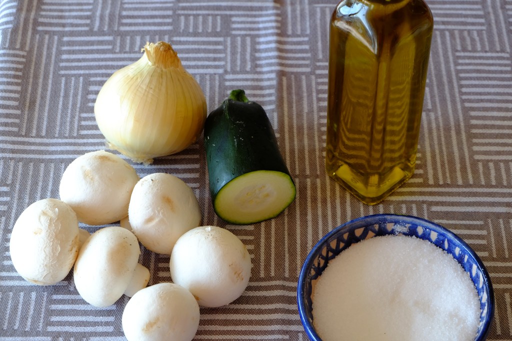 INGREDIENTES. Salteado de cebolla, calabacín y champiñones. (2 raciones aprox)