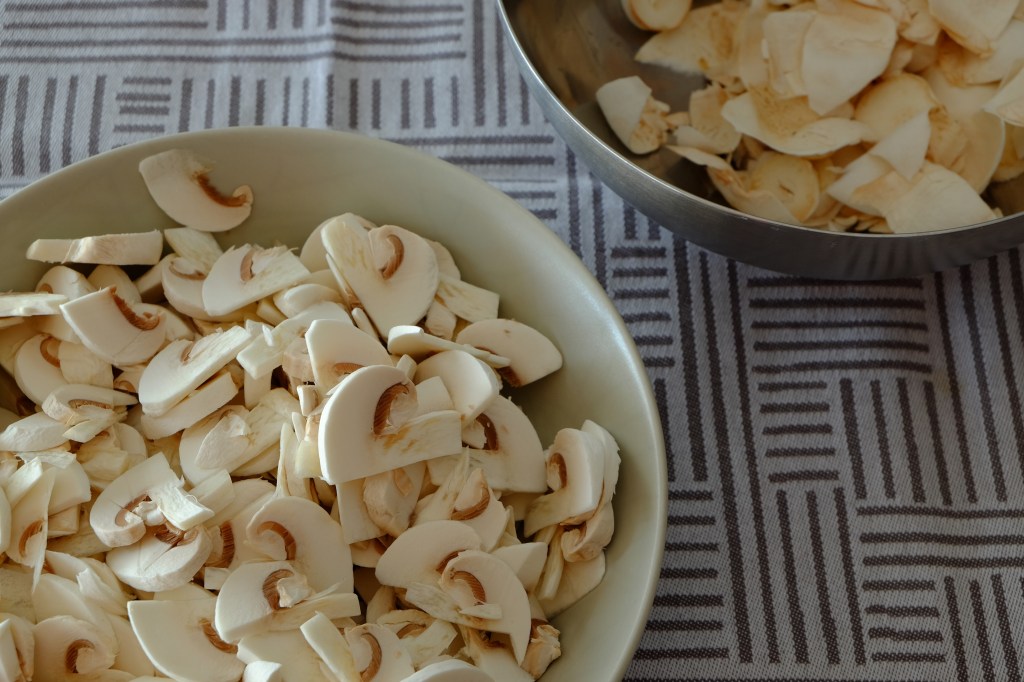 Limpiar los champiñones. Retirar un poco del tronco y pelarlos. A me gusta pelarlos, no suelo mojarlos como al resto de setas y hongos. Pero si trae muchísima tierra, pasar un trapo húmedo. Filetear los champiñones al tamaño que más te guste. Añadir sal y remover bien.