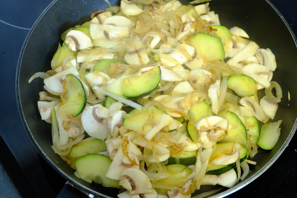 Pelar y cortar la cebolla en juliana fina. Añadir a la sartén con el aceite y rehogar a fuego medio hasta que empiece a dorarse. Lavar bien el calabacín y cortar lascas, no muy finas. Añadir a la cebolla que hemos pochado previamente. Echar una pizca de sal para que ayude a que se cocine. Mientras limpiar, pelar y filetear los champiñones. Cuando veamos ligeramente transparente el calabacín, agregar los champiñones laminado y otro poco de sal.