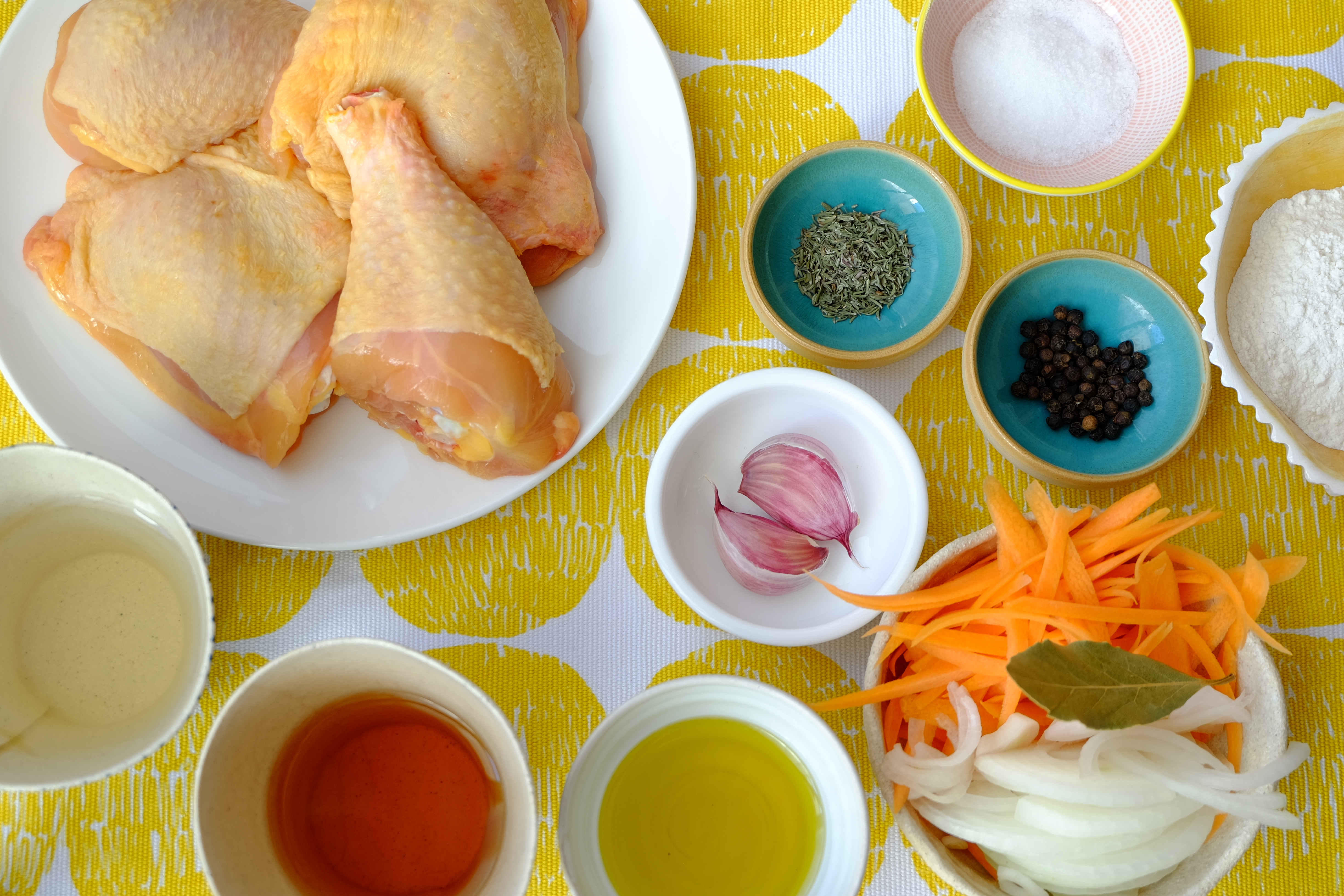 Añadir los granos de pimienta, el tomillo y la hoja de laurel. Rehogar junto a las verduras. Agregar el vinagre, el vino y el pollo que previamente habíamos dorado. Por último añadir el agua, que llegue casi a cubrir el pollo, un poco de sal y dejar cocinar todo durante 30 minutos a fuego bajo, con una tapa que permita salir el vapor. Darle la vuelta a mitad de cocción al pollo para que se haga de manera homogénea y se cocine con la salsa. Pinchar el pollo, si entra bien el tenedor es que está cocinado. Probar de sal y rectificar. Verás como la salsa habrá reducido y se habrá espesado ligeramente.