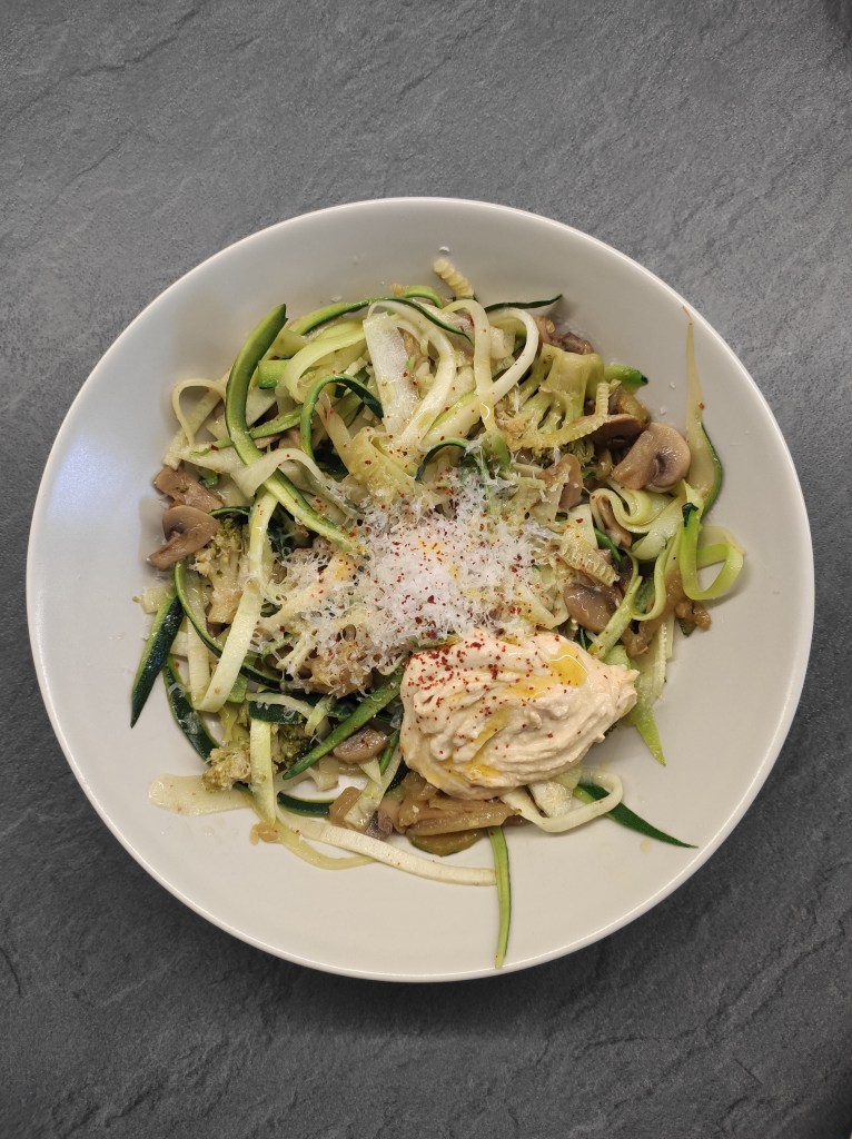 Espaguetis de calabacín con salteado de cebolla, champiñón, calabacín y brócoli con hummus, escamas de pimentón y parmesano. En un sartén saltea los espaguetis con un poco de aceite, añadir el salteado de verduras y emplatar con una cucharada de hummus, chorrito de aceite de oliva virgen extra y escamas picantes de pimentón de la Vera. Tenéis la receta en el blog del hummus casero y del salteado.
