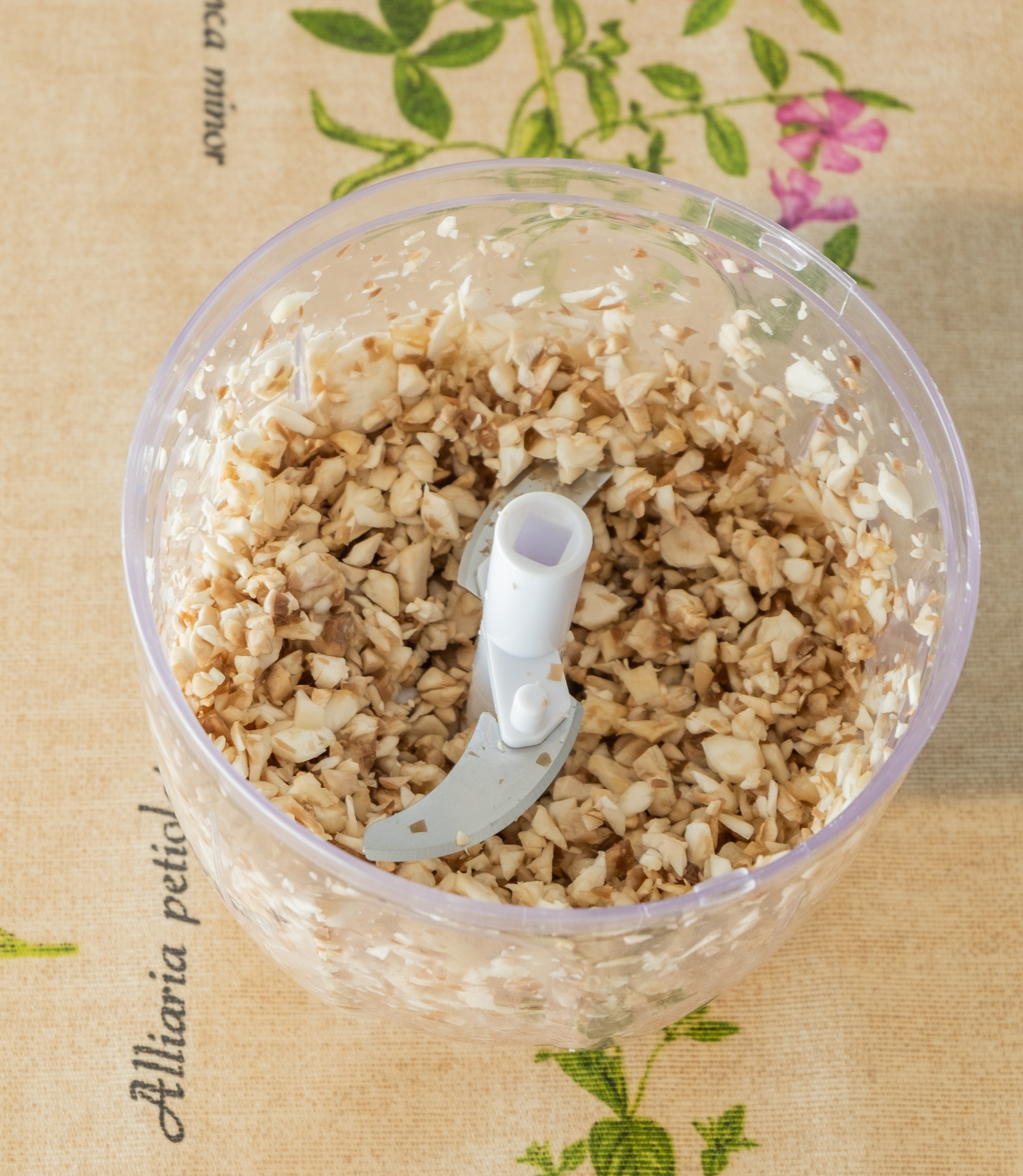 Pelar y picar la cebolla en trozos pequeños. Añadir el aceite a la sartén y sofreír la cebolla hasta que esté ligeramente dorada. Limpiar los champiñones, cortar en 4 o 6 trozos, depende del tamaño y meter en la picadora de la batidora. Triturar hasta obtener trozos pequeños. Simularán la carne picada.
