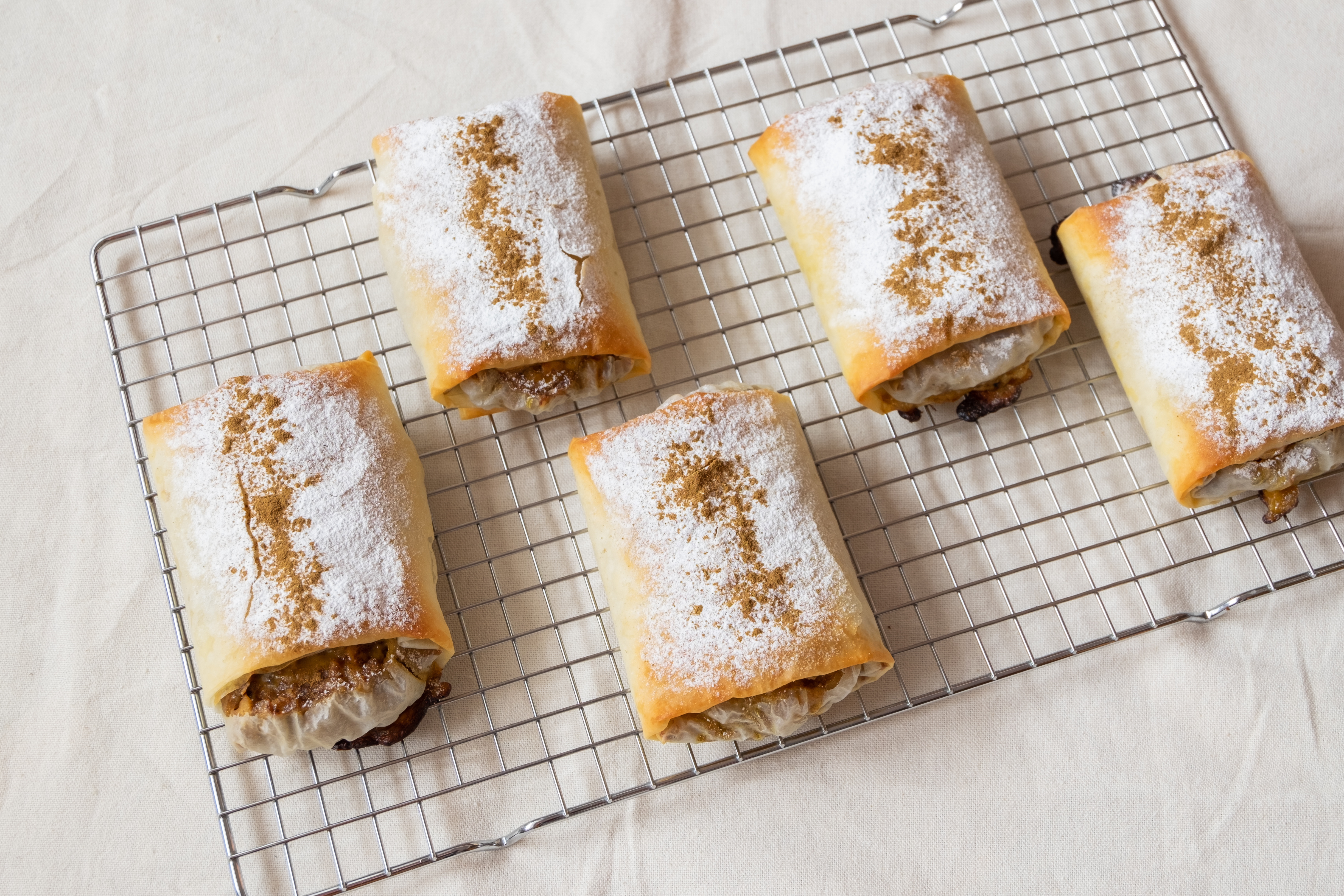 Sacar del horno y dejar enfriar 10 minutos. A continuación, espolvorear azúcar glas por encima de cada paquete y una pizca de canela en polvo.