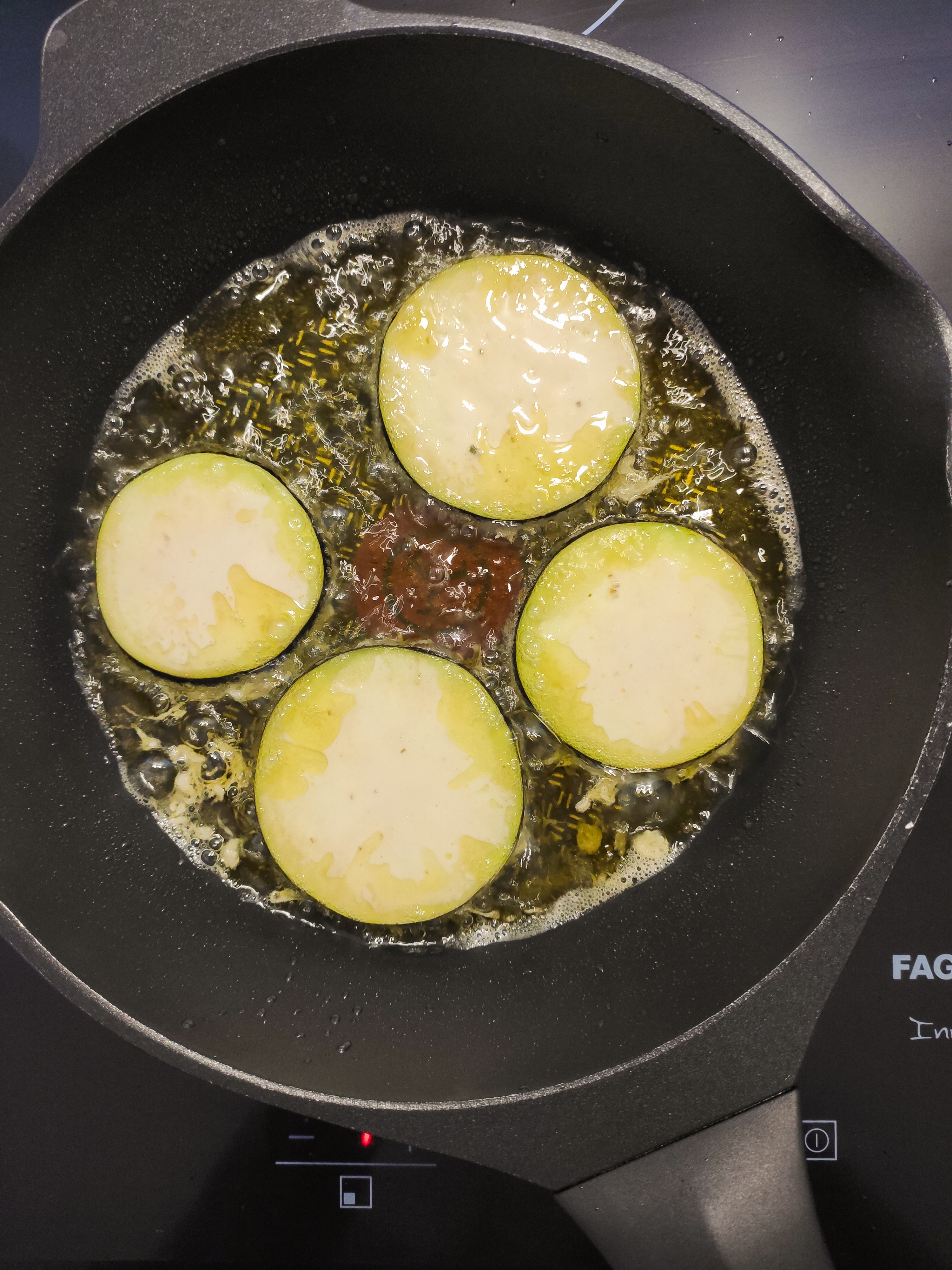Poner una sartén al fuego con aceite que cubra bien el fondo. Pasar las rodajas por la masa, sacudir el exceso y añadir a la sartén con el aceite caliente. Cocinar con ambos lados a fuego medio. Necesitan 1 ó 2 minutos por lado, dependerá del grosor de la rodaja. El exterior tiene que quedar muy crujiente y un interior blando y cremoso.
