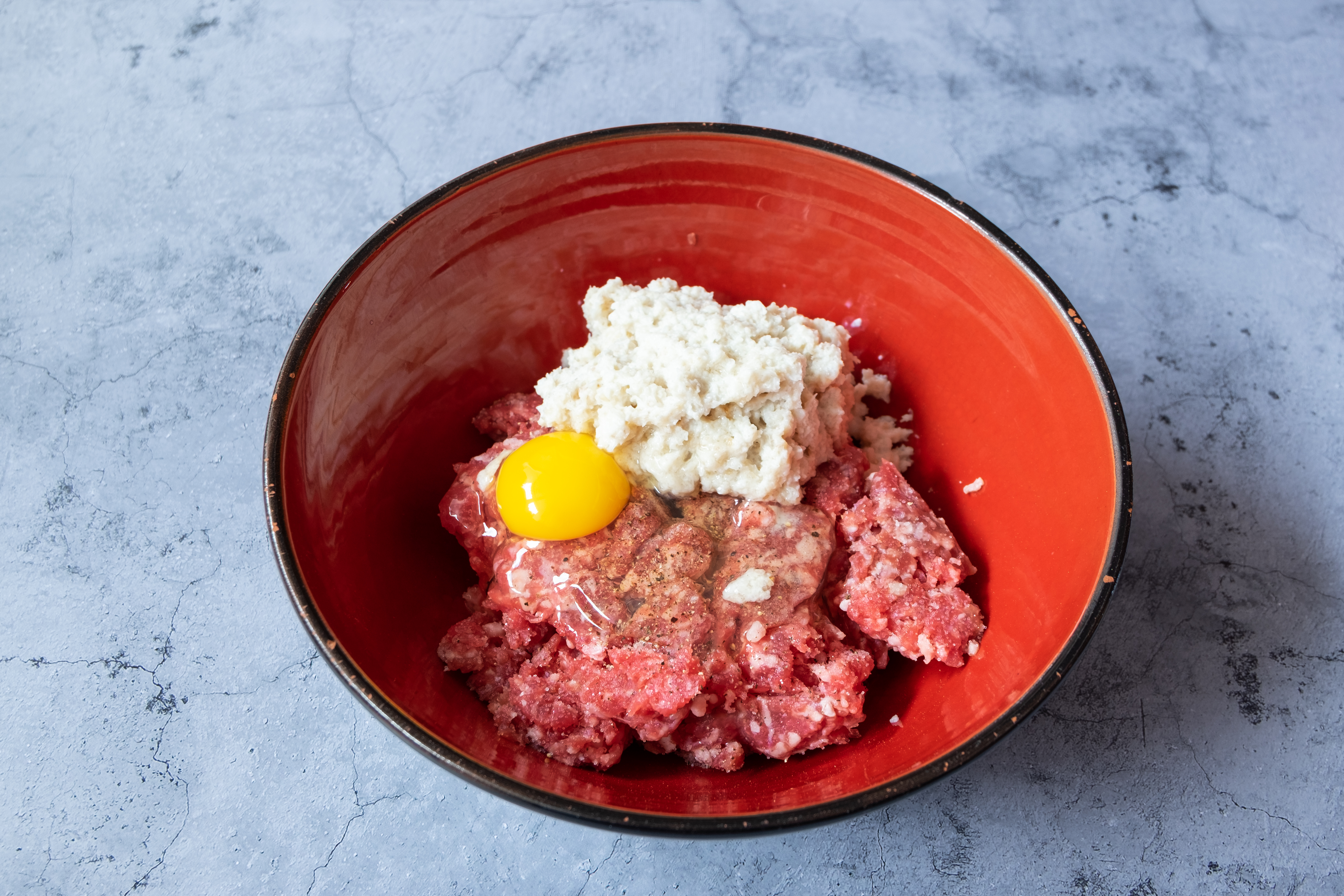 Poner a remojo la miga de pan con la leche durante unos minutos. En un cuenco, añadir la carne picada, salpimentar, agregar el huevo y la miga previamente remojada. Remover bien. Hazlo con un tenedor o con las manos bien limpias. Dejar reposar en la nevera tapada durante 15 minutos.