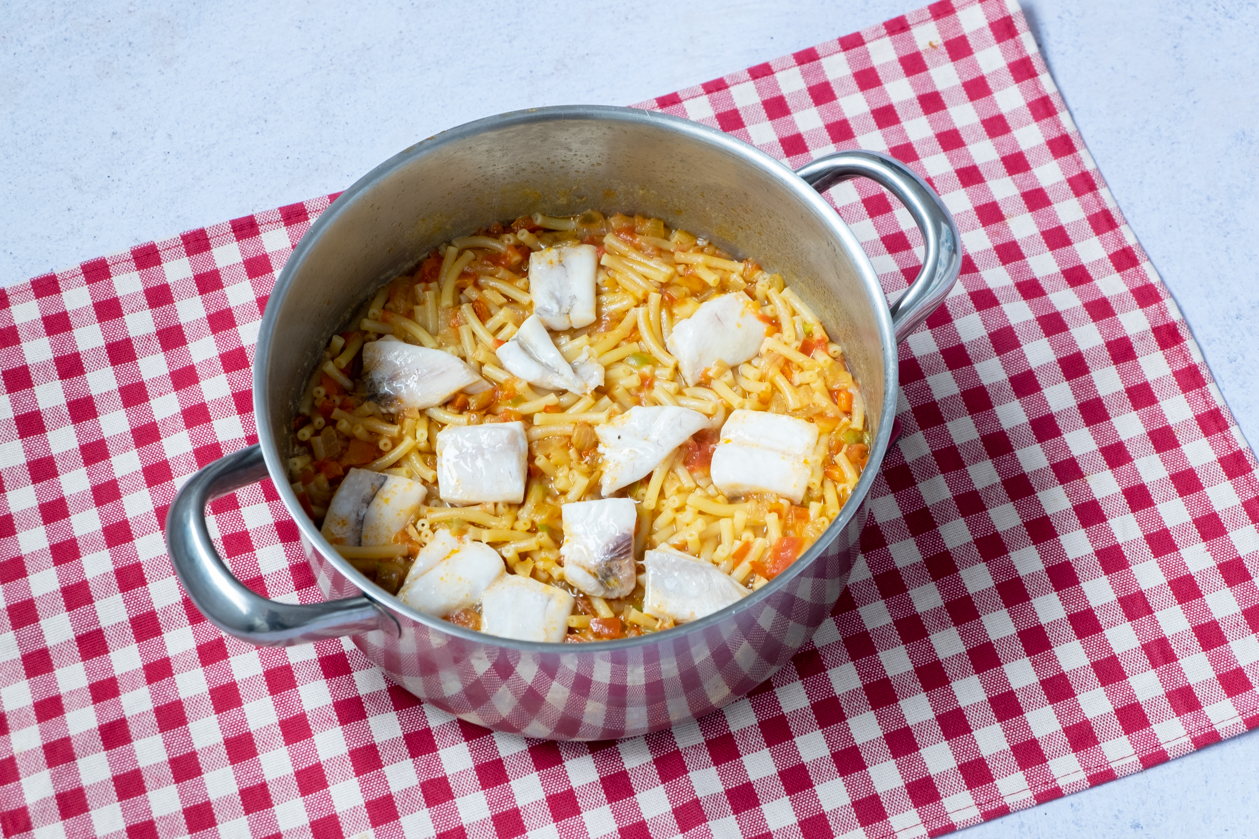 Incorporar los fideos y rehogar bien con el sofrito. Cubrir con el fumet caliente y ajustar de sal. Dejar cocinar hasta el tiempo que diga el paquete de los fideos para dejarlo al dente. Antes de que se consuma el líquido y hacia el final de la cocción, añadir la palometa limpia, sin piel ni espinas y en cuadrados. Dejar 2 minutos, tapar y retirar del fuego.